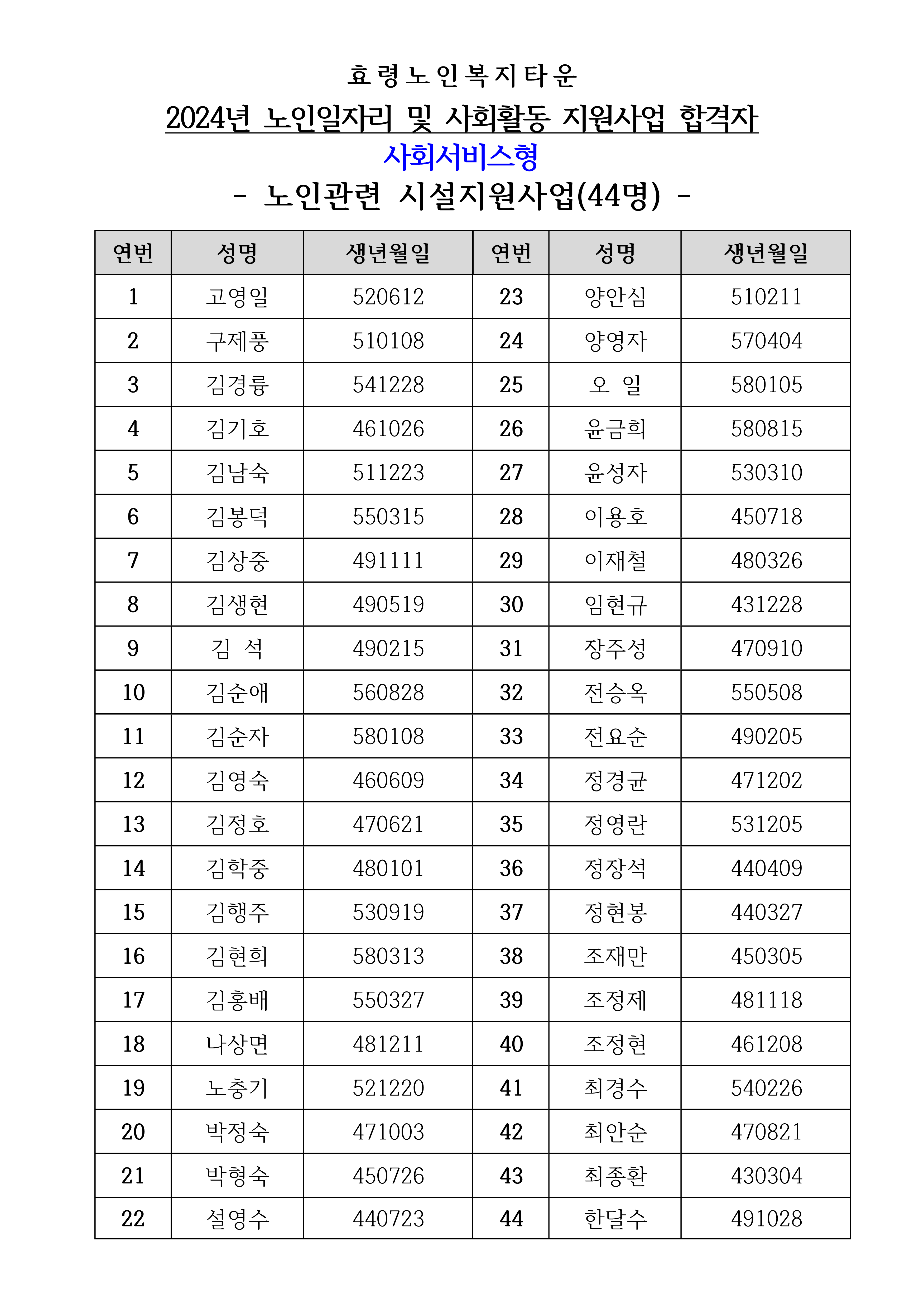2024년 노인일자리 및 사회활동 지원사업 참여 합격자 명단(사회서비스형)